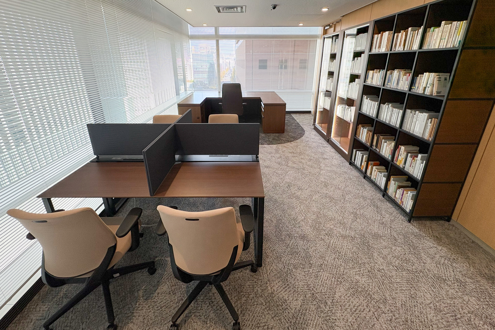 文祥堂は、図書室の書架や什器を納めさせていただいた経緯もあり、文庫スペース作りのお手伝いをさせていただきました。中心となる執務机の重厚感を引き立てながら、ご来訪の皆様が利用しやすい閲覧スペースとして相応しい内装をご提案いたしました。